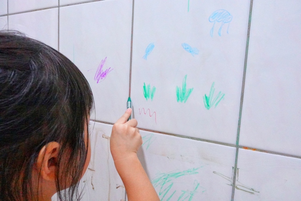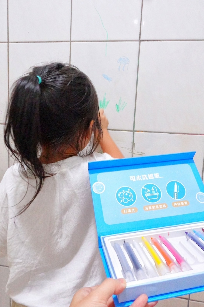 我們還沒有體驗過在浴室畫畫啦!~伸縮水洗蠟筆可以畫在磁磚、牆面、地板
