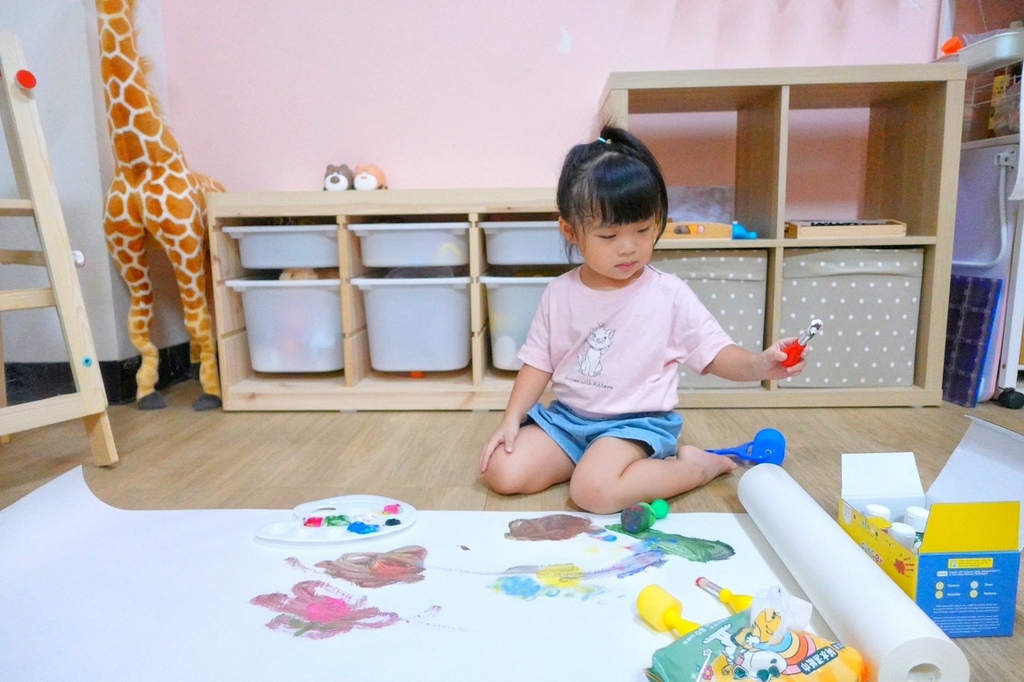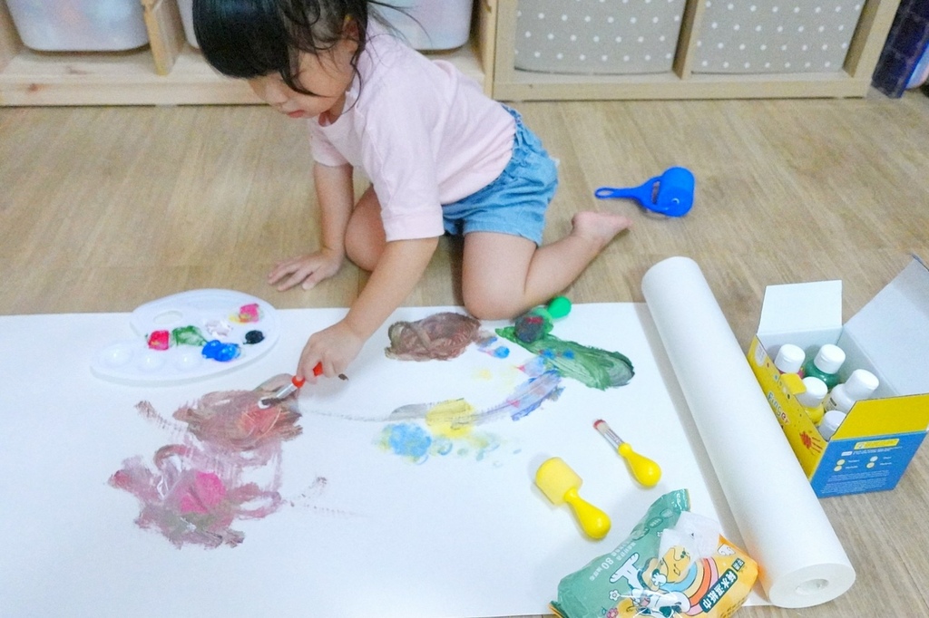 第一次玩顏料還是隨意書局買的水彩,邊玩都超擔心她會吃到顏料