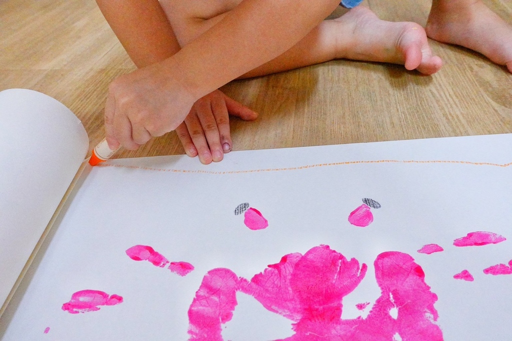 手指膏也可以跟孩子玩手掌按壓,再用大豆蠟筆一起進行創意聯想